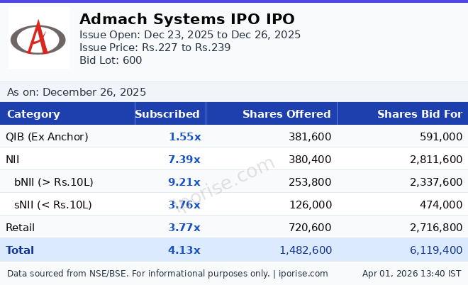 As of December 26, 2025, the Admach Systems IPO has been subscribed 4.13 times overall. The IPO is fully subscribed.