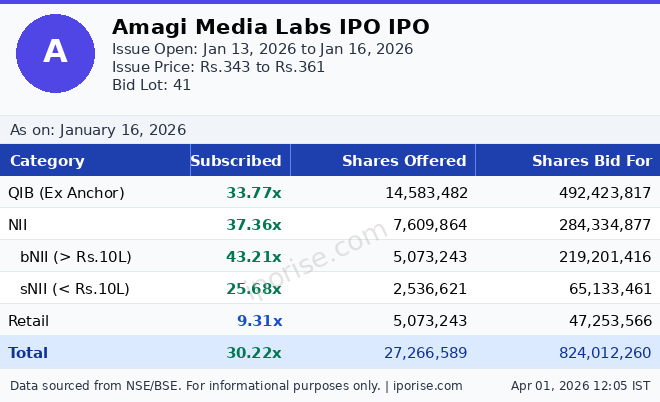 As of January 16, 2026, the Amagi Media Labs IPO has been subscribed 30.22 times overall. The IPO is fully subscribed with strong investor demand.