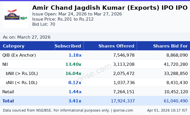 Amir Chand Jagdish Kumar (Exports) IPO subscribed 3.41 times — as of Mar 27, 2026