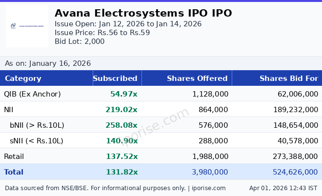 The Avana Electrosystems IPO subscription tracks how many times each investor category has subscribed relative to their reserved quota. As of Jan 16, 2026, the overall subscription stands at 131.82× — Massively Oversubscribed.