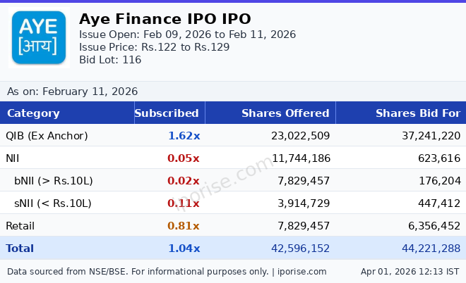 As of February 11, 2026, the Aye Finance IPO has been subscribed 1.04 times overall. The IPO is fully subscribed.
