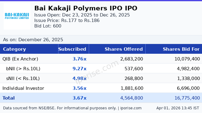 As of December 26, 2025, the Bai Kakaji Polymers IPO has been subscribed 3.67 times overall. The IPO is fully subscribed.
