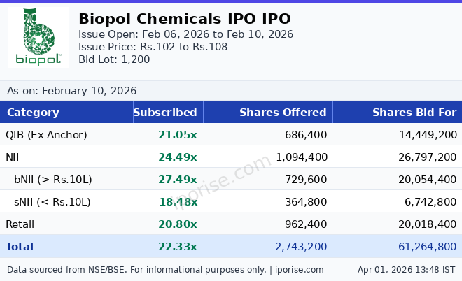 As of February 10, 2026, the Biopol Chemicals IPO has been subscribed 22.33 times overall. The IPO is fully subscribed with strong investor demand.