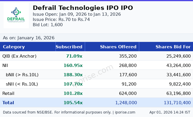 As of January 16, 2026, the Defrail Technologies IPO has been subscribed 105.54 times overall. The IPO is fully subscribed with strong investor demand indicating extremely high interest.