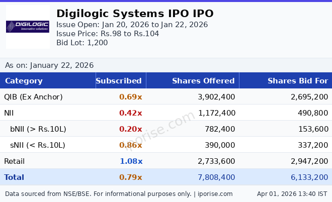 As of January 22, 2026, the Digilogic Systems IPO has been subscribed 0.79 times overall. The IPO subscription is below 1×.