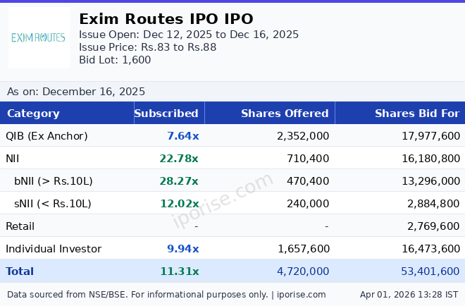 As of December 16, 2025, the Exim Routes IPO has been subscribed 11.31 times overall. The IPO is fully subscribed with strong investor demand. A total of 8,805 applications received across all categories.