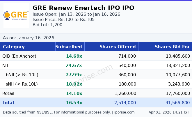 As of January 16, 2026, the GRE Renew Enertech IPO has been subscribed 16.53 times overall. The IPO is fully subscribed with strong investor demand.
