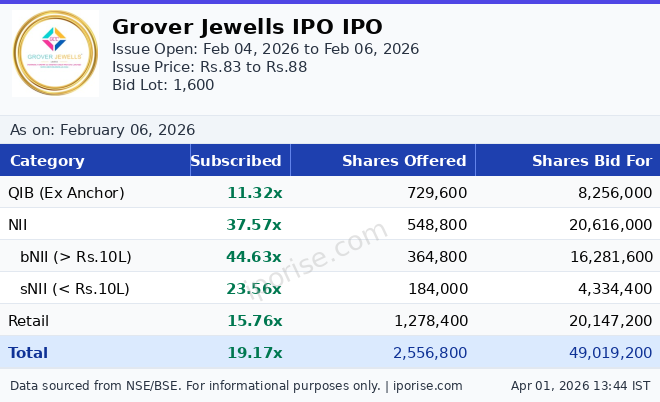 As of February 06, 2026, the Grover Jewells IPO has been subscribed 19.17 times overall. The IPO is fully subscribed with strong investor demand.