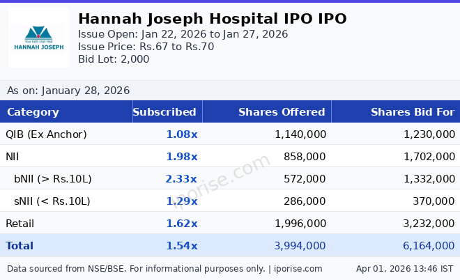 As of January 28, 2026, the Hannah Joseph Hospital IPO has been subscribed 1.54 times overall. The IPO is fully subscribed.