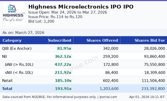 As of March 27, 2026, the Highness Microelectronics IPO has been subscribed 193.91 times overall. The IPO is fully subscribed with strong investor demand indicating extremely high interest.