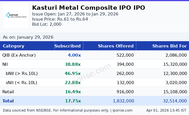 As of January 29, 2026, the Kasturi Metal Composite IPO has been subscribed 17.75 times overall. The IPO is fully subscribed with strong investor demand.