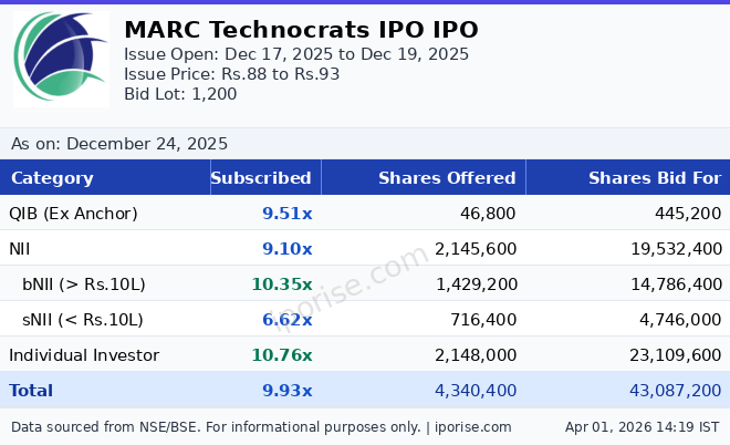 As of December 24, 2025, the MARC Technocrats IPO has been subscribed 9.93 times overall. The IPO is fully subscribed. A total of 14,765 applications received across all categories.