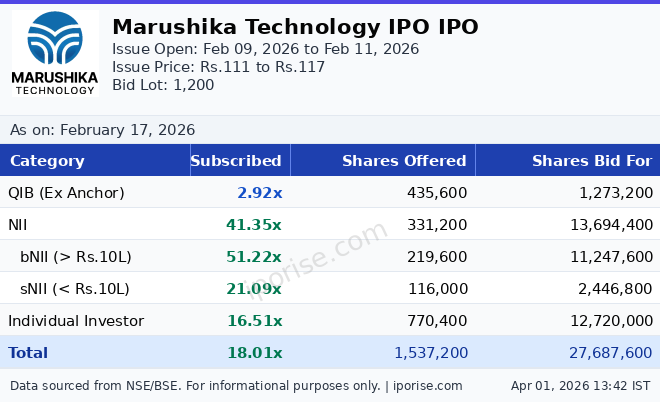 As of February 17, 2026, the Marushika Technology IPO has been subscribed 18.01 times overall. The IPO is fully subscribed with strong investor demand. A total of 8,994 applications received across all categories.
