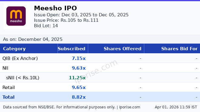 Meesho subscribed 8.82 times — as of Dec 04, 2025