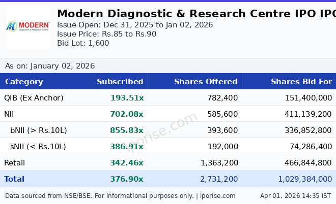 Modern Diagnostic & Research Centre IPO subscribed 376.90 times — as of Jan 02, 2026