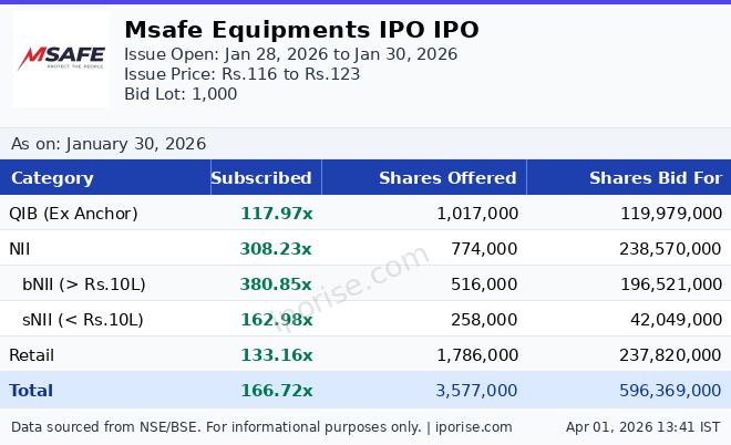As of January 30, 2026, the Msafe Equipments IPO has been subscribed 166.72 times overall. The IPO is fully subscribed with strong investor demand indicating extremely high interest.