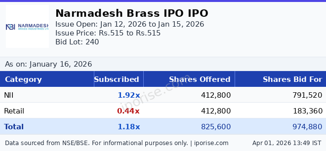 As of January 16, 2026, the Narmadesh Brass IPO has been subscribed 1.18 times overall. The IPO is fully subscribed.
