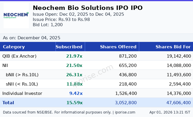 Neochem Bio Solutions IPO subscribed 15.59 times — as of Dec 04, 2025
