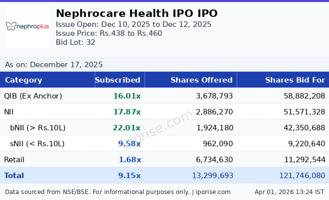 As of December 17, 2025, the Nephrocare Health IPO has been subscribed 9.15 times overall. The IPO is fully subscribed.