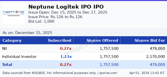 As of December 15, 2025, the Neptune Logitek IPO has been subscribed 0.27 times overall. The IPO subscription is below 1×.