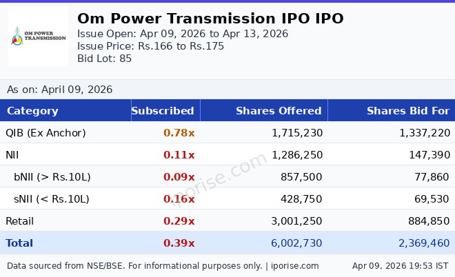 As of April 09, 2026, the Om Power Transmission IPO has been subscribed 0.39 times overall. The IPO subscription is below 1×.
