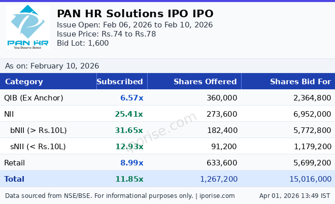 As of February 10, 2026, the PAN HR Solutions IPO has been subscribed 11.85 times overall. The IPO is fully subscribed with strong investor demand.