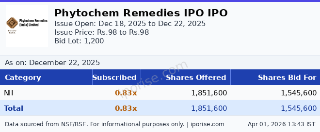 As of December 22, 2025, the Phytochem Remedies IPO has been subscribed 0.83 times overall. The IPO subscription is below 1×.