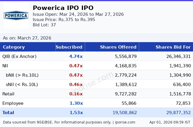 As of March 27, 2026, the Powerica IPO has been subscribed 1.53 times overall. The IPO is fully subscribed.