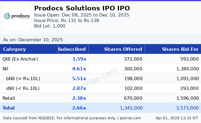 As of December 10, 2025, the Prodocs Solutions IPO has been subscribed 2.66 times overall. The IPO is fully subscribed.