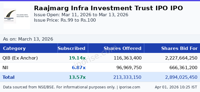 As of March 13, 2026, the Raajmarg Infra Investment Trust IPO has been subscribed 13.57 times overall. The IPO is fully subscribed with strong investor demand.