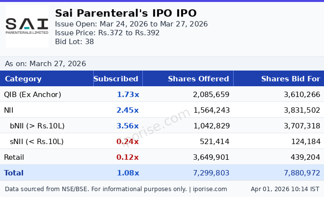 As of March 27, 2026, the Sai Parenteral's IPO has been subscribed 1.08 times overall. The IPO is fully subscribed.