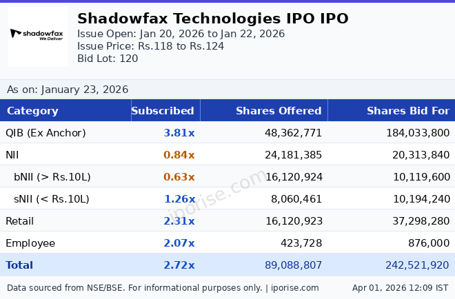As of January 23, 2026, the Shadowfax Technologies IPO has been subscribed 2.72 times overall. The IPO is fully subscribed.