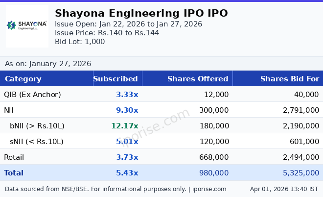 As of January 27, 2026, the Shayona Engineering IPO has been subscribed 5.43 times overall. The IPO is fully subscribed.