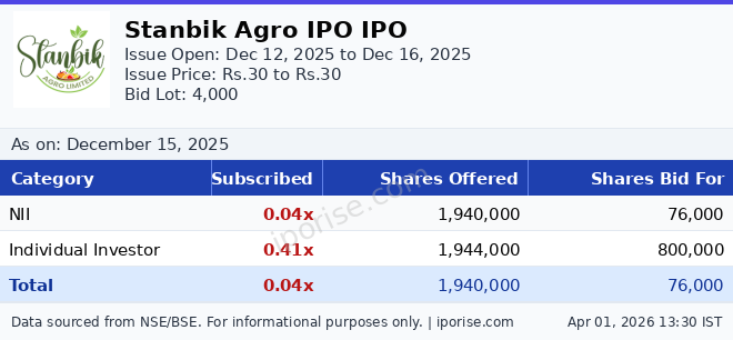 As of December 15, 2025, the Stanbik Agro IPO has been subscribed 0.04 times overall. The IPO subscription is below 1×.