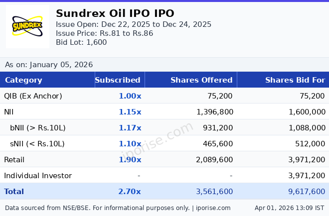 As of January 05, 2026, the Sundrex Oil IPO has been subscribed 2.70 times overall. The IPO is fully subscribed. A total of 1,241 applications received across all categories.