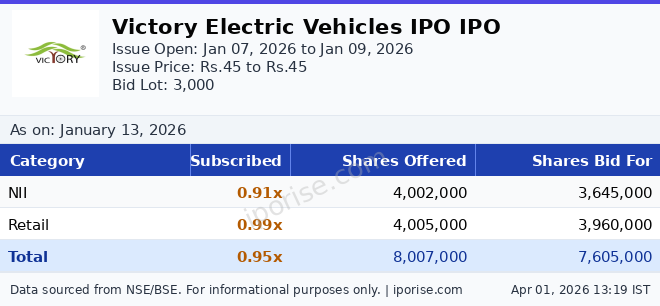 As of January 13, 2026, the Victory Electric Vehicles IPO has been subscribed 0.95 times overall. The IPO subscription is below 1×.