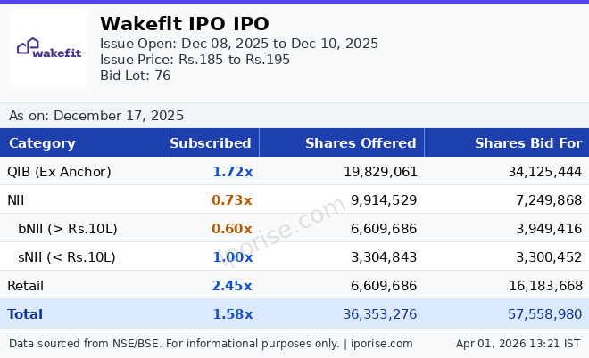 As of December 17, 2025, the Wakefit IPO has been subscribed 1.58 times overall. The IPO is fully subscribed.